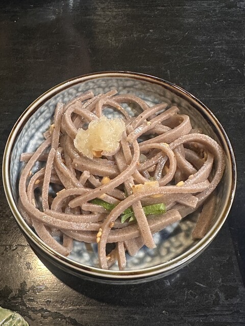 今回は、お店の看板メニューである「護摩もり」をいただく前に、フランス産の蕎麦粉で打ったお蕎麦を特別に提供してくださいました。これがまた、オリーブオイルとの相...