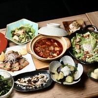 ●前菜小鉢 ●鶏ささみのタタキ ●気まぐれサラダ ●お刺身1 ●お刺身2 ●赤龜ポテトサラダ ●フライドポテト ●鶏の唐揚げ ●シェフ渾身の炒め物 ●お口直しの冷菜 ●本格土鍋麻婆ご飯 ●デザート