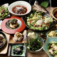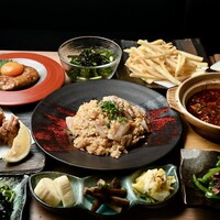 ●干し豆腐のジェノベーゼ ●鶏ささみのタタキ~山椒ネギソース~ ●国産黒毛和牛炙りの大根サラダ ●極上牛タンユッケ ●エビマヨ玉子春巻き ●特製エビチリ ●本格土鍋式麻婆豆腐 ●豚トロガーリックチャーハン ●デザート