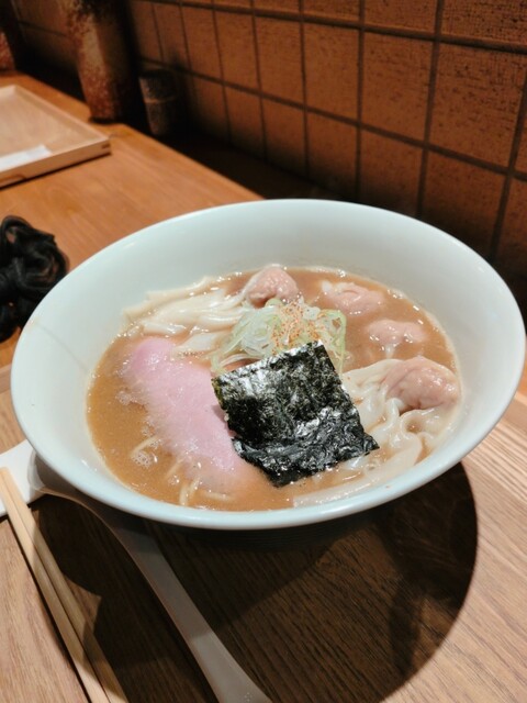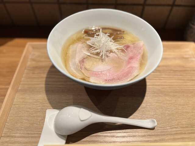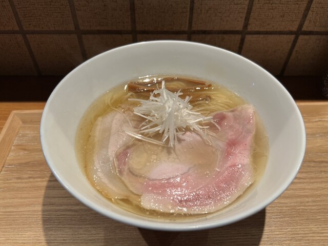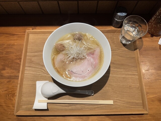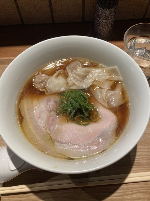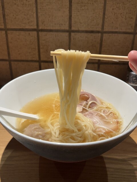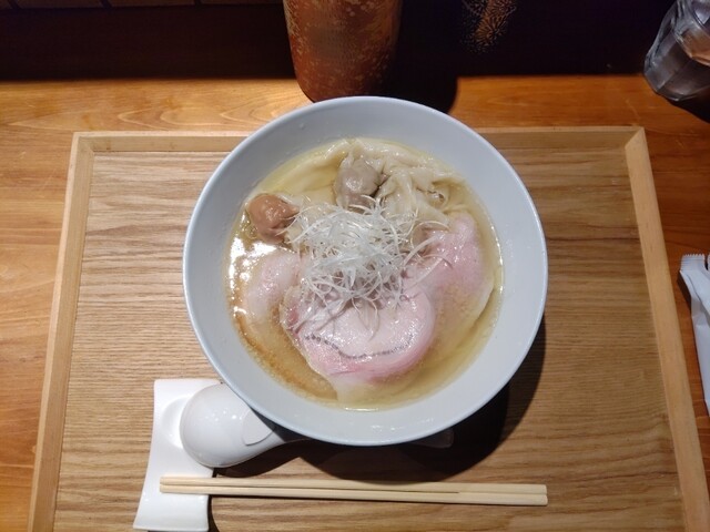 綺麗な店内でしばし待ってワンタン塩らぁめん提供。提供時に丁寧にワンタン(地鶏と豚)の説明をされるのは新鮮。