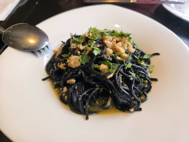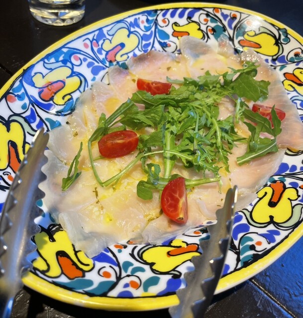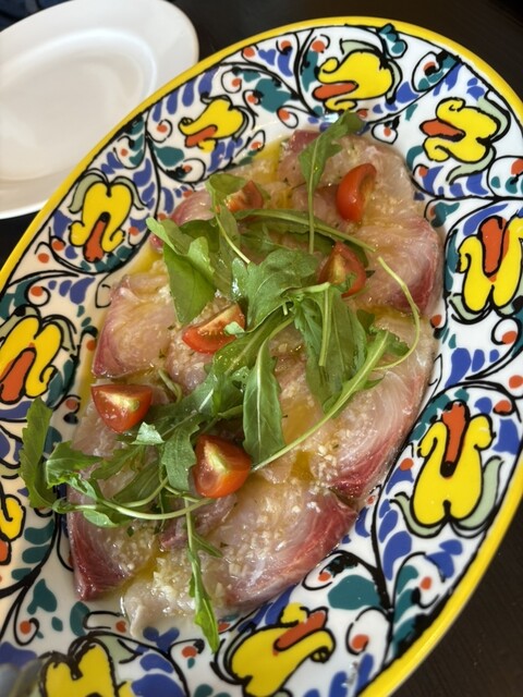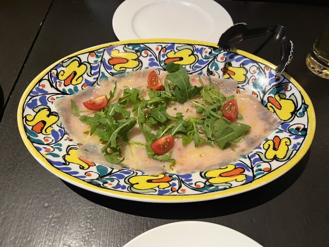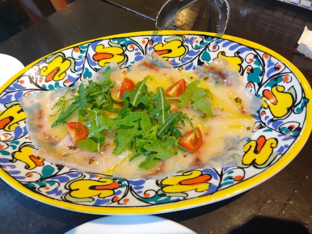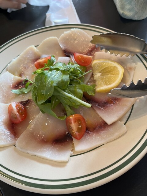 前菜のメカジキのカルパッチョは量が多くメカジキがとても脂がのっていてオリーブオイルの風味もふんだんに感じられておいしくて感激でした。