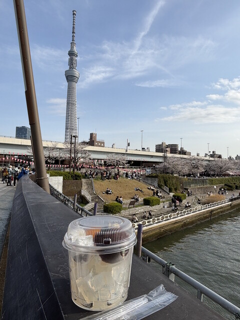 少し強い春の日差しの中、隅田川を見ながらいただきました。