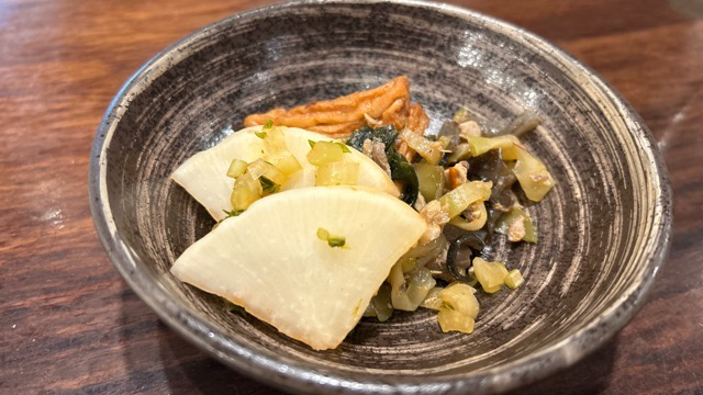 お通しが漬物や煮物の盛り合わせてくるのですでにお酒がすすんでしまうのですが、