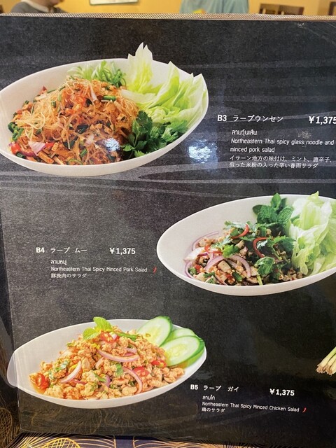 タイ料理はサラダの種類がたくさんあり、その中でも「ヤム・ウンセン」はかなり知名度の高い人気メニュー。春雨サラダ「ヤム・ウンセン」とタイ料理を代表する人気料理「ラープ」が合体したものがこちら。レシピ的には、たたく、炒る、擦る、刻むなど各素材の下準備が非常に手間暇かかるラープ。それだけでも激ウマなのに、さらに春雨が入り香ばしくてジューシーな美味しさが数段レベルアップしてます。春雨が旨味を吸ってるんでしょうね。もちろんラープ特有の爽やかなハーブ感もばっちり。さらに、カオクワのプチプチ感と春雨のもっちり感が合わさって、食感もすごく良い。個人的には必食の一皿。