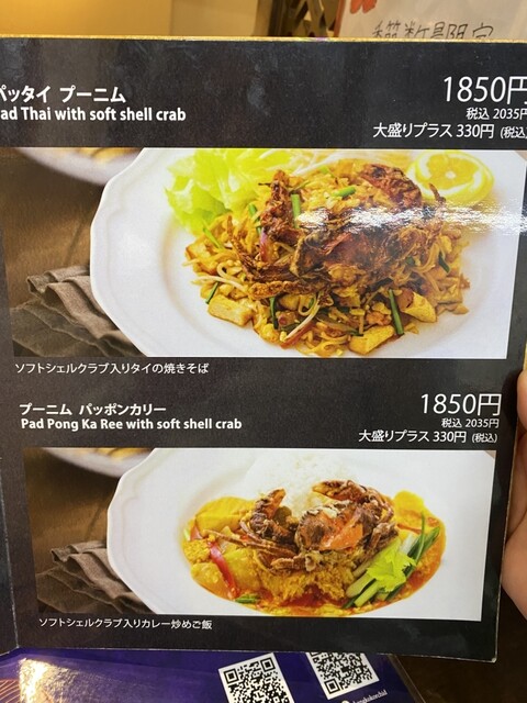 ソフトシェルクラブを和えた?と言うか、どっさり乗っけたソムタム。蟹を入れたソムタムと言えば、ナムパラーを使うソムタムプーパラーを思い浮かべる方もいると思いますが、こちらはパラーではなくナンプラーベース。スタンダードなソムタムタイのアレンジバージョン。シャキシャキ感とジューシー感が絶妙なバランスのソムタムに、プーニムのかりふわ食感が組み合わさった、とっても食べ応えのあるソムタムです。天ぷらそばの天ぷらが、蕎麦の汁を吸ってめちゃくちゃ美味しくなる原理と同様に、プーニムがソムタムの甘辛酸っぱい汁を纏って病みつきの美味しさに。しかも、脂っこさも無くて軽い。