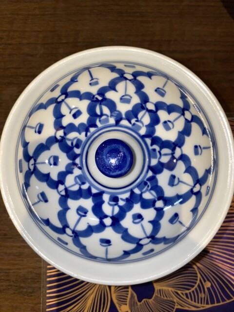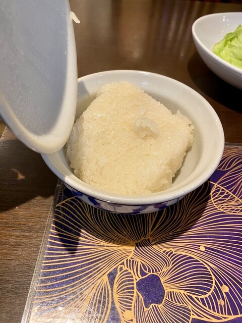 カオニャオはよくある籠ではなく、ブルー&ホワイト(タイ語ではラーイ・クラーム)の器に。美しい器で頂くカオニャオは格別。
