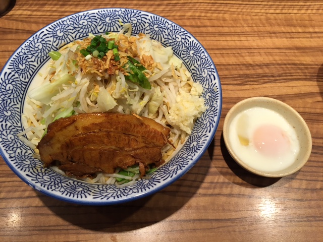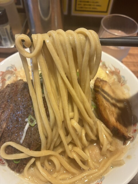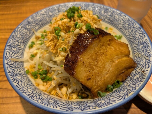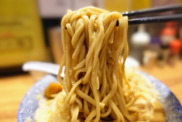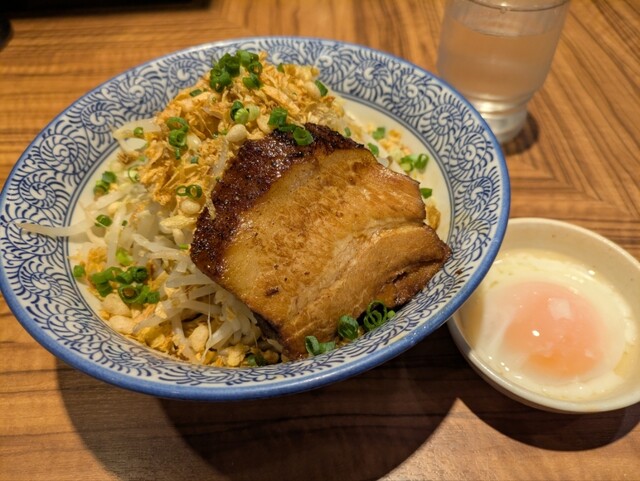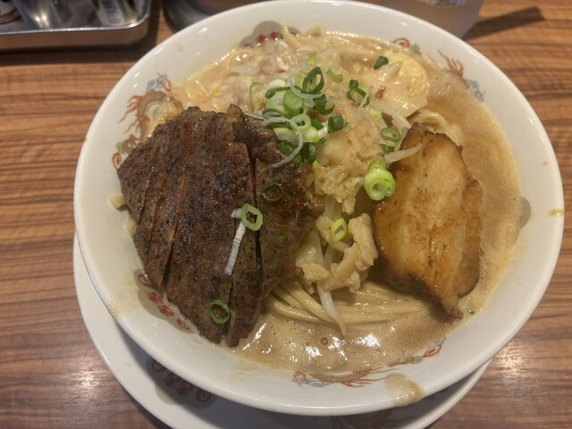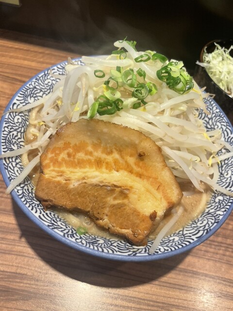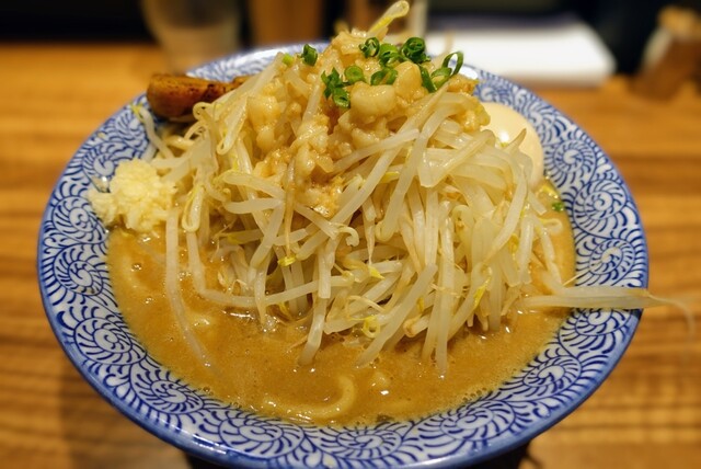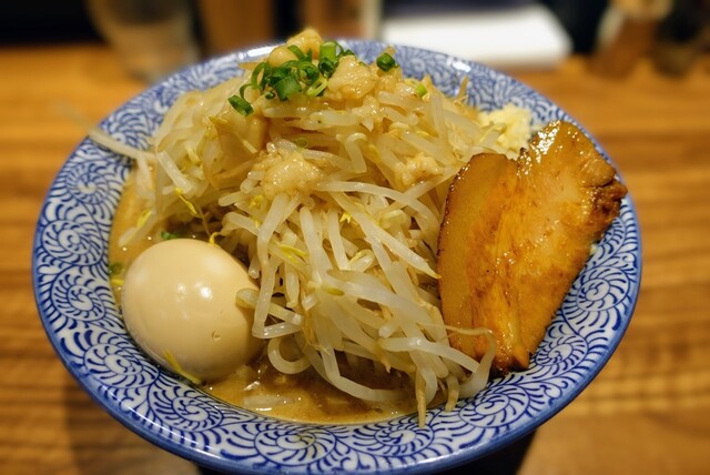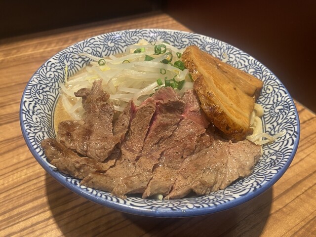 一番人気のラーメンは二郎インスパイア系の濃厚乳化豚骨ラーメン。太い麺に野菜がたっぷりとのり、食べごたえがあります。オススメは牛ステーキトッピング。さらに、木曜日限定の台湾まぜそば(昼夜各20食限定)も売切れ必至の人気メニューです。
