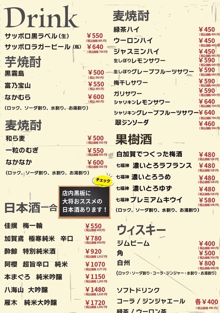 | ドリンク | 日本酒あり、焼酎あり、日本酒にこだわる、焼酎にこだわる |