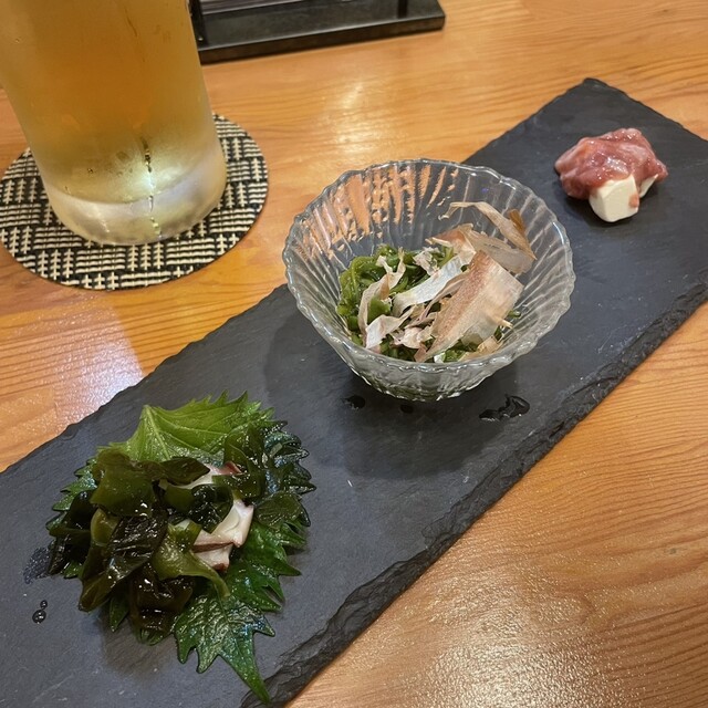 お通しわポークジャーキーにもずく甘海老の塩辛!