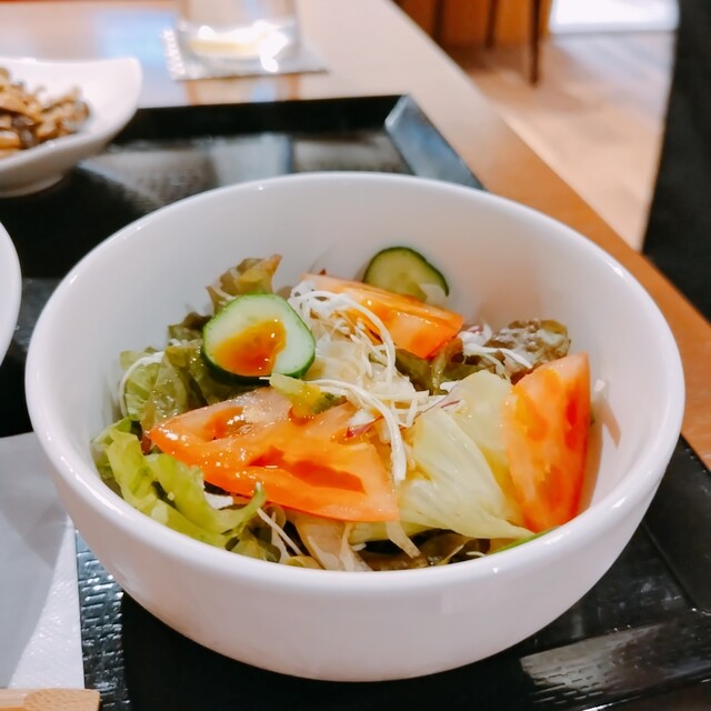 定食はメインのおかずにたっぷりのサラダ、小鉢(茸のソテー)、ライス、中華スープ、杏仁豆腐といった内容。