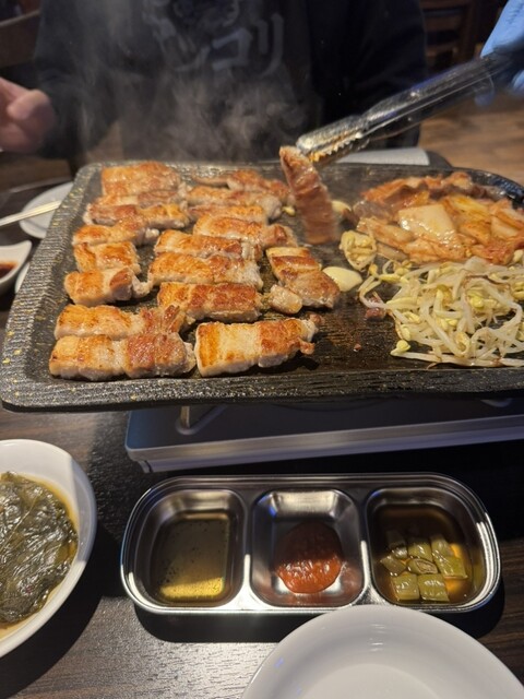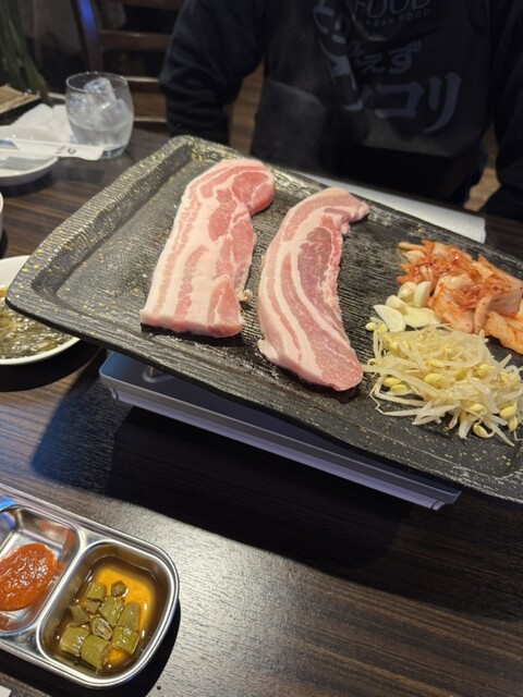 サムギョプサルは、1.5cmにこだわっているそうです。 もち豚を2人前とハイライフ1人前の計450gを頼みました。お店の方がお肉を焼いてくれるスタイルです。 お肉は大人とは別に... 詳細を見る