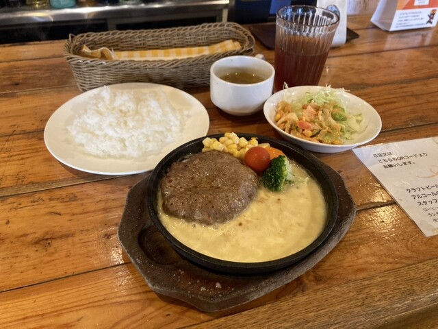先にサラダとランチスープが提供され、10分弱でメインが到着。レギュラーメニューの「チーズとろとろハンバーグ」に使われているチェダーチーズとは違い、白色を帯びたチーズでした。