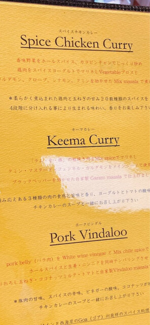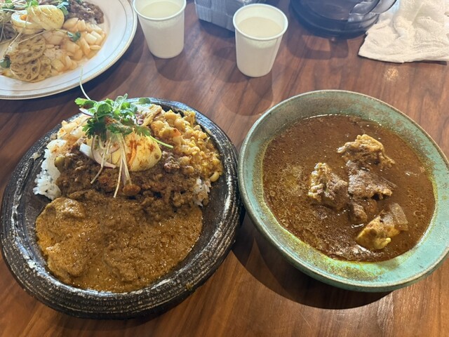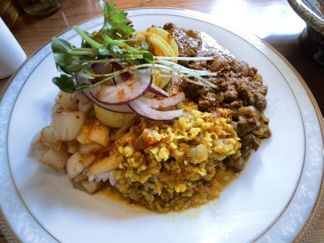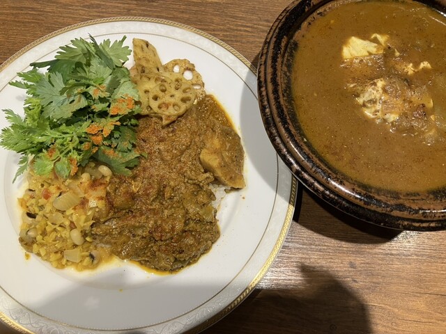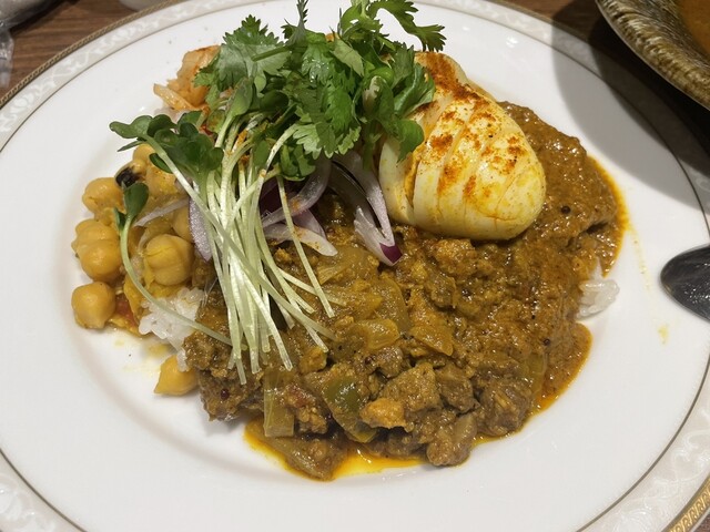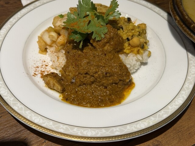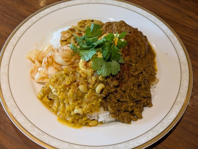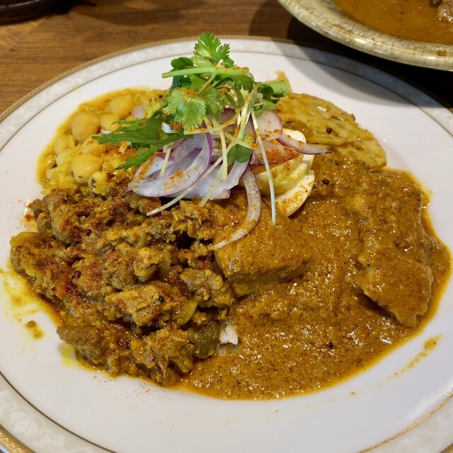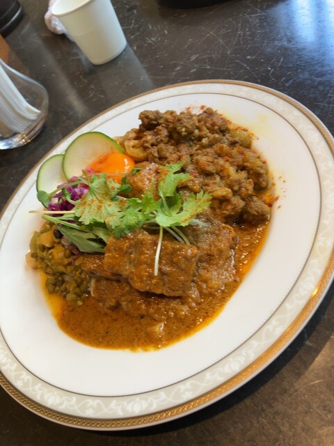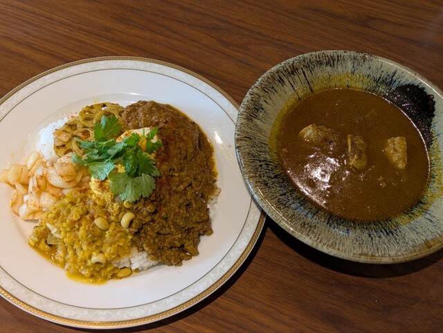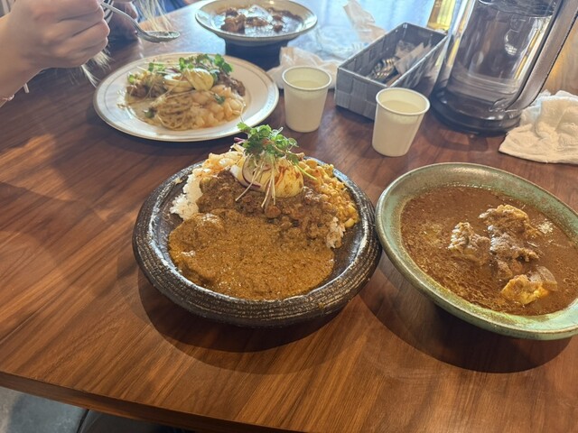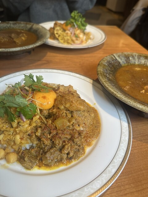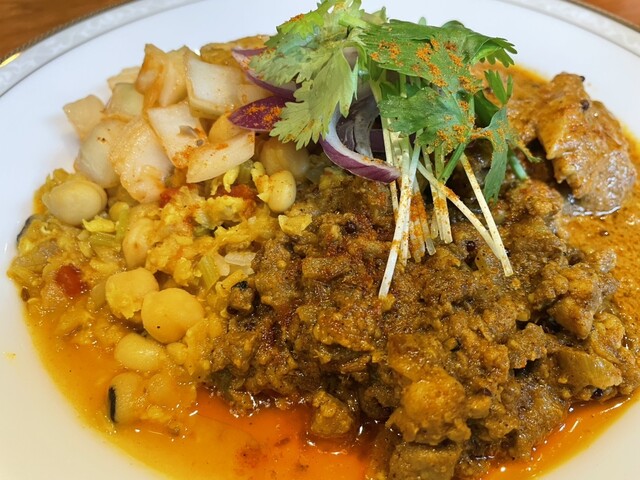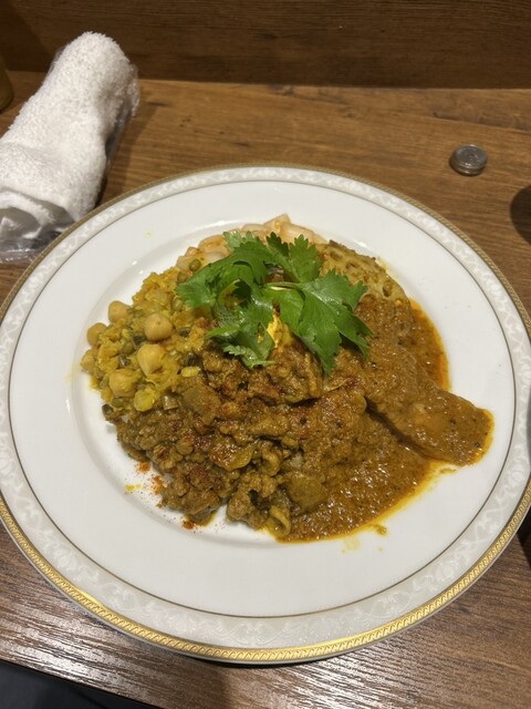3種類のカレーを頼むとポーク、キーマ、豆のプレートとチキンカレーの4種類があり、どれもスパイスが効いていてとても美味しかったです。特にポークはお肉がホロホロで、キーマはお肉感が強く食べたことのない肉感...