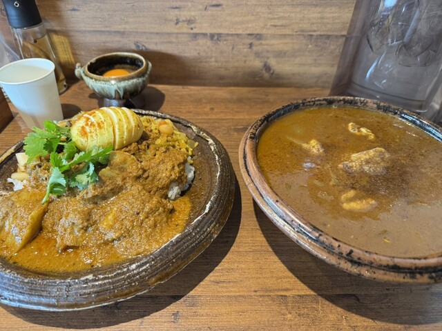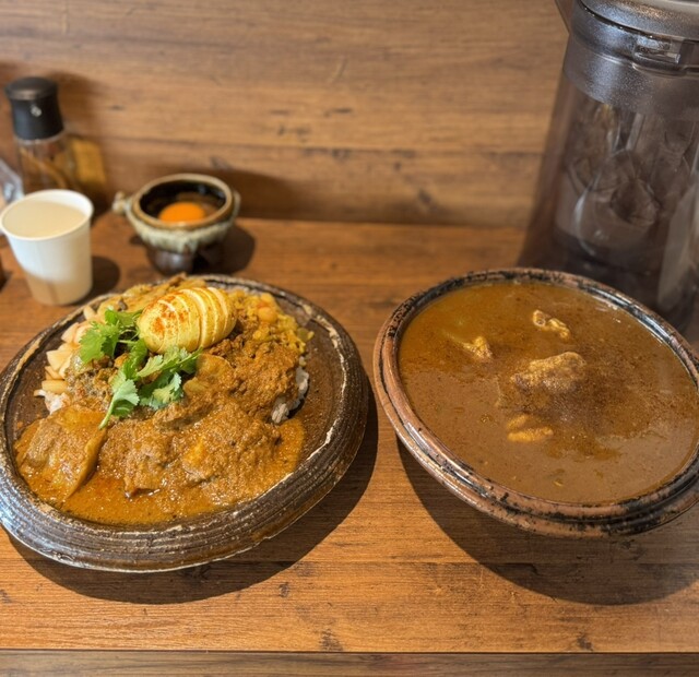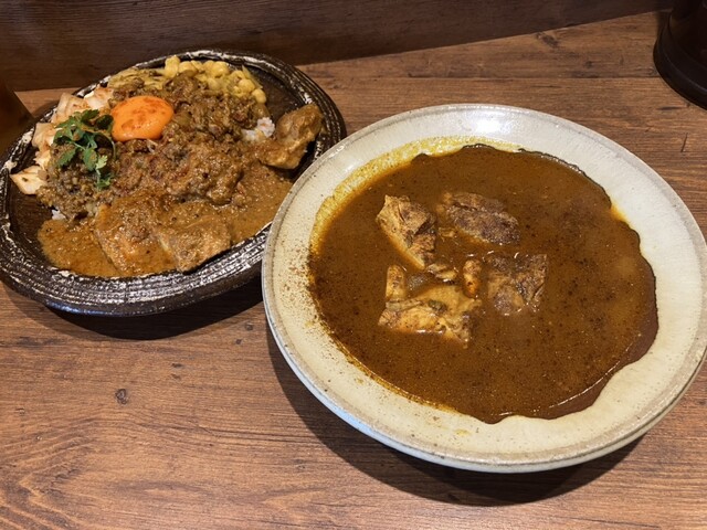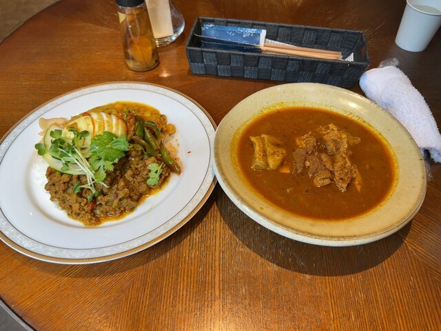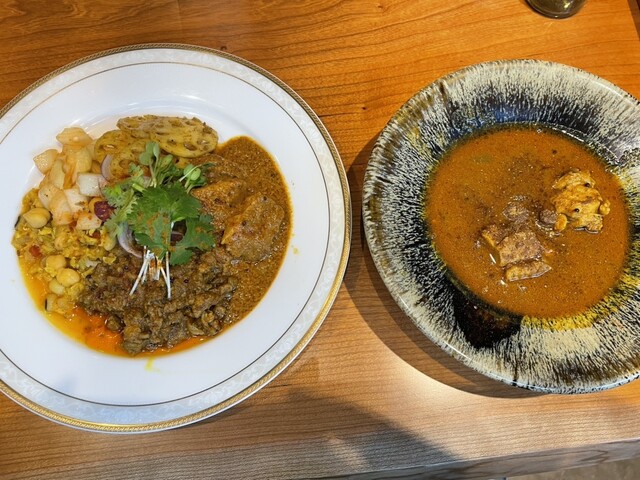 チキンとキーマ、2種類のカレーがなんと別々の皿に盛られて登場します。