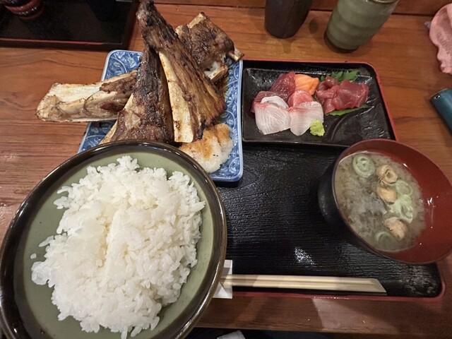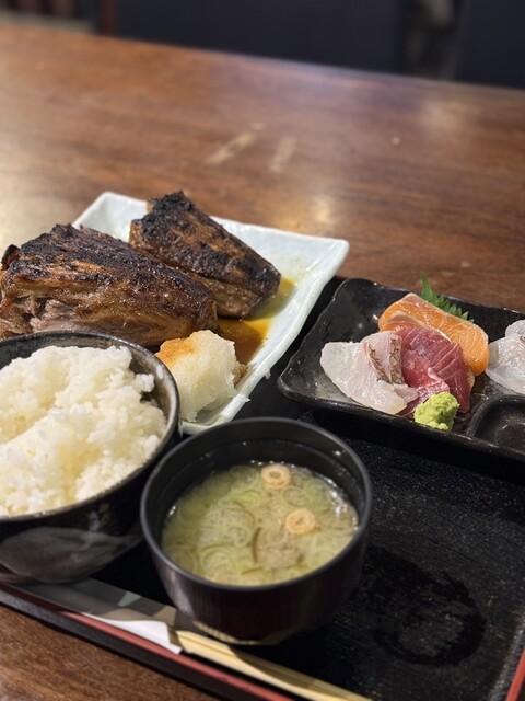 セットは、鮪かま(中)炭火焼き、お刺身、ご飯、お味噌汁のラインナップ!