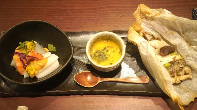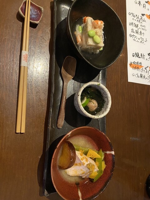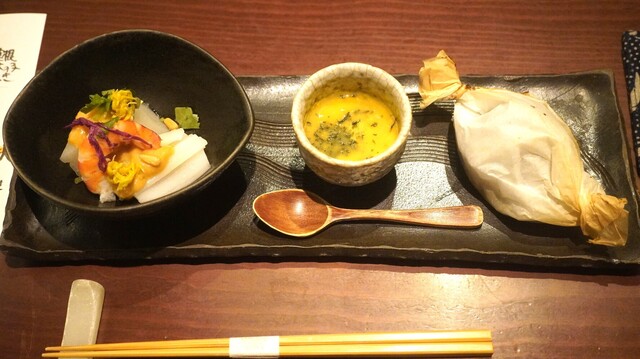 築地の端っ子、勝どき寄りの通り沿いにある、大人の隠れ家的な割烹です。12月よりコース専門にメニュー変更をするのだそうです。 予約して、平日の夜、二名で訪問しました。 ■7,000円 プリフィクス・コース 前菜三種=①聖護院大根の柚子味噌 ②南瓜の擦り流し ③じゃが芋、レンコン、キノコの... 詳細を見る