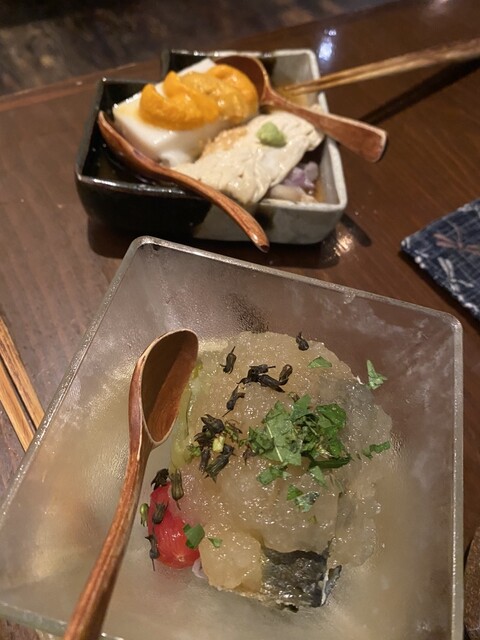 前菜もいつも通りに感動させてもらえる。鰤の藁炙りに甘鯛の昆布締めにお酒も進む!太刀魚のコンフィが素晴らしい!