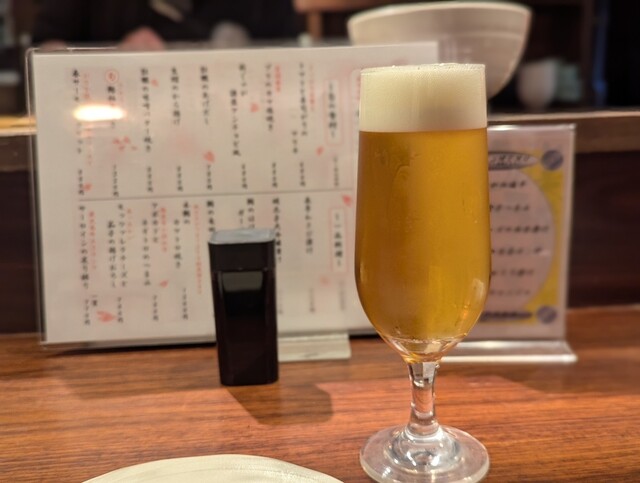 お通しは、たこの吸盤とイカの塩辛。どちらもお酒にぴったりの塩梅で、スタートから気分が上がります。乾杯はプレモル(600円)。しっかり冷えていて最高でした。