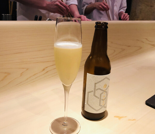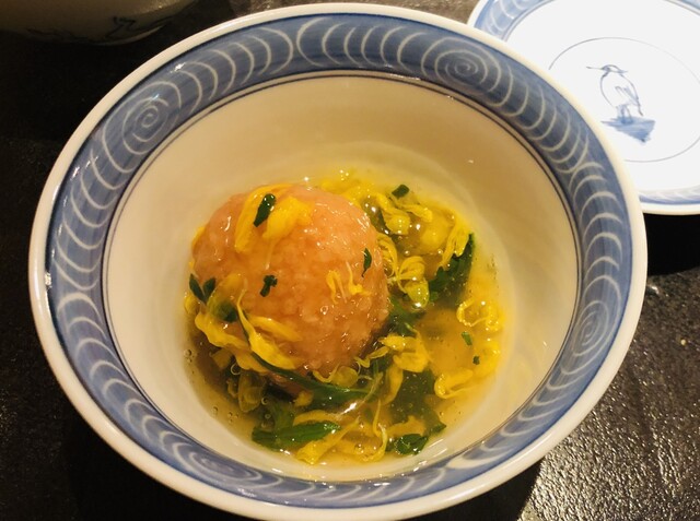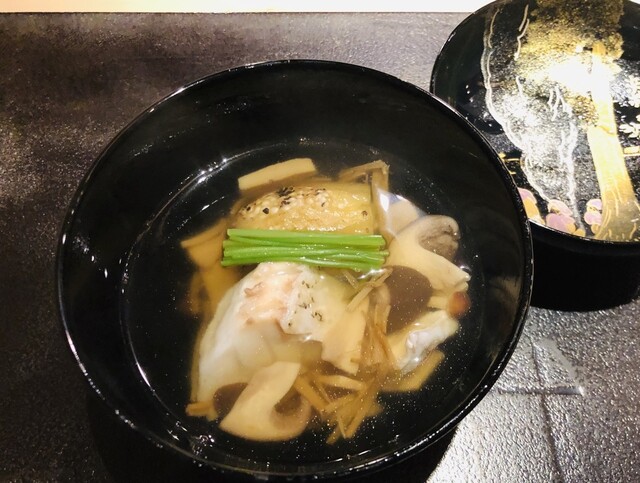 コースはこの店のスペシャリテの1つ、揚げた胡麻豆腐から始まる。焼き胡麻豆腐と違い、しっかりとした味わいとカリッとした食感が美味しい。椀物は長崎県五島列島産のクエ。この時期の脂の乗りの軽い小振りなクエに走りの松茸を合わせている。国産が出る前の今話題のブータン松茸、今年最後のロット。香りも味わいも国産と区別がつかない素晴らしい出来。