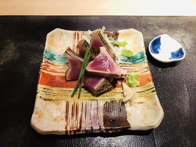 京料理をベースにカツオの藁焼きをスペシャリテとした会席料理の店。コンパクトな設えながら、銀座らしい品のあるインテリアと、カウンター席の目の前で炎と煙を上げ、燻し焼きとするカツオの豪快さのコントラストが、ミシュランの星を維持する理由かもしれない。銀座で2店、六本木で1店を展開する大将が、初めてミシュランの星を獲得した旗艦店でもある。