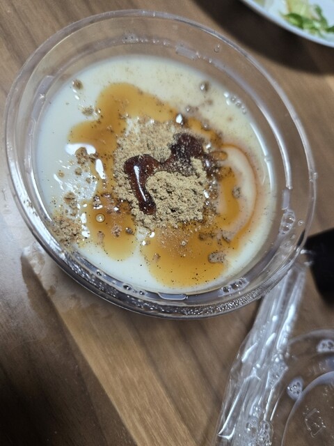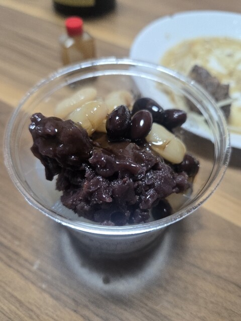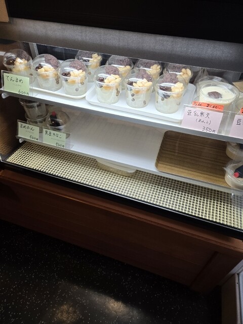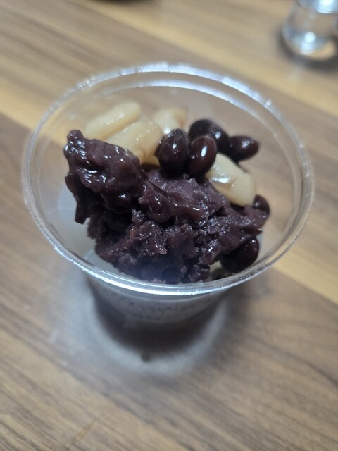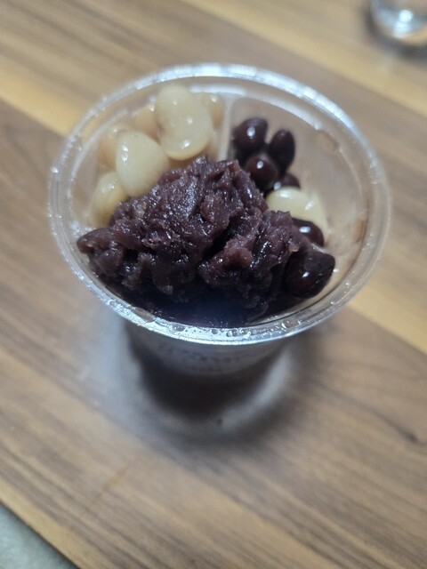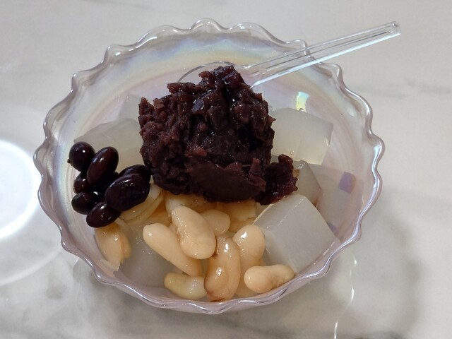 お店の方にはまずは黒蜜をかけずに4種の豆と寒天を味わっ...