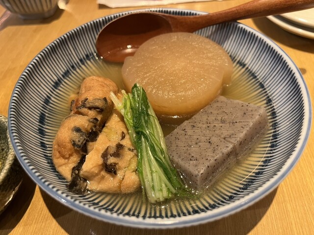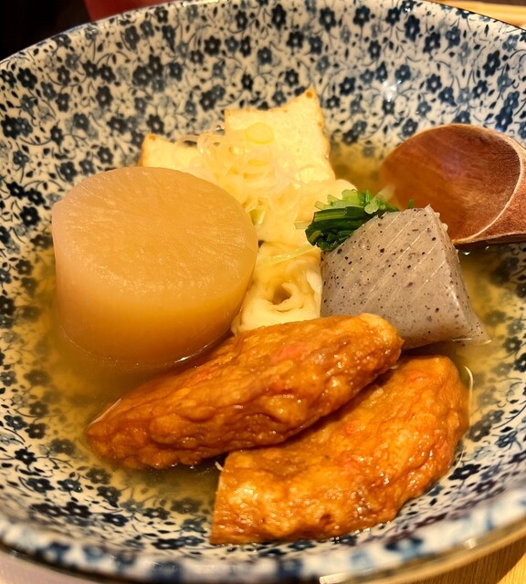 新富町駅から徒歩3分、優しさの中にしっかりと旨味があるおでんが魅力の居酒屋。定番の大根等は勿論、変わり種のロールキャベツやトマトおでんも美味。