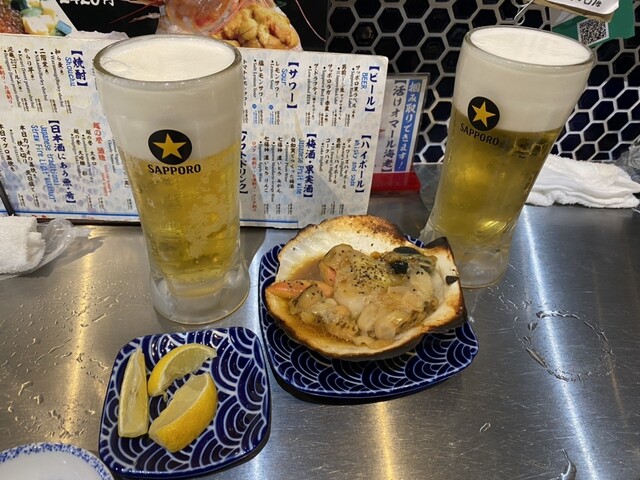 たまご焼き、まぐろ、タコのお刺し身をつまんだあと、ウロウロしていると入口の美味しそうな海鮮の写真と、イカを焼いているにおいにつられて店内へ入って...
