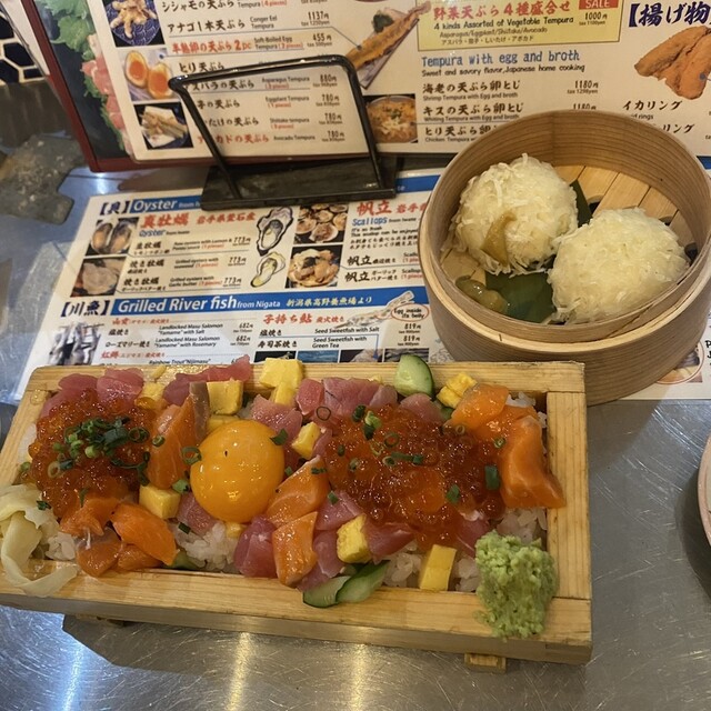 メニューが豊富で刺し身から天ぷらなどの揚げ物、ちょっとしたつまみから海鮮丼まで。