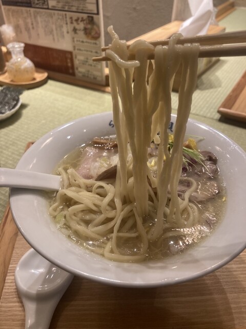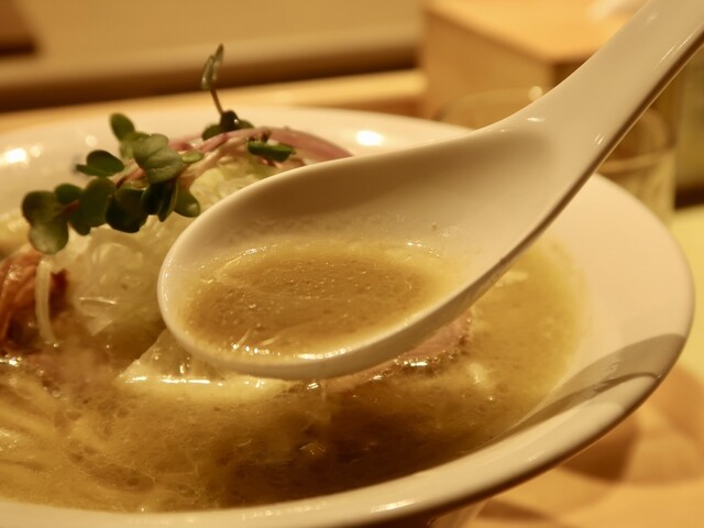 大山鶏のガラと丸鶏、そして魚介類を六時間かけて煮込んだ清湯鶏スープと二種類のあさり、しじみの貝出汁を、ブレンドしたWスープとなっています。