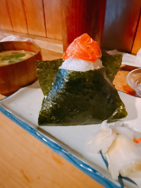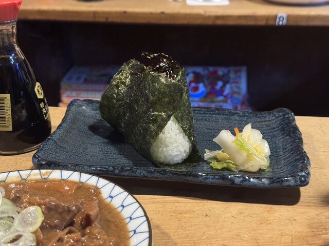 煮込み、ぬた、おにぎり(鮭)、なめこ汁に