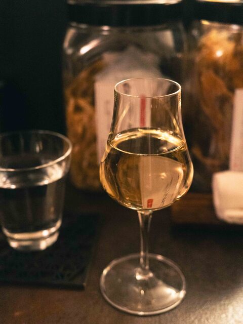 グラスで飲んだ三芳菊酒造の日本酒「ネコと和解せよ」がとてもおいしかった。