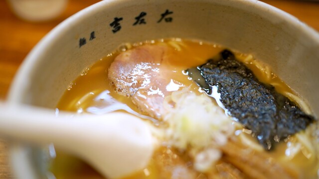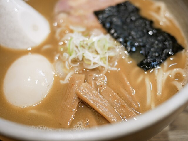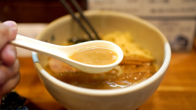 ■料理 ◇味玉つけ麺:¥1300 ・つけ汁:濃厚で風味の強い魚介を豚骨がクリーミーにしている。魚介や豚骨の雑味や臭みは一切なし。昆布やどんこの旨みに加え、カレー粉のスパイシーさが締まりを出しており、魚介豚骨の理想系。 ・麺:中細麺300g。締まった麺はツルツルモチモチで、程よい硬さ。やや細めの... 詳細を見る