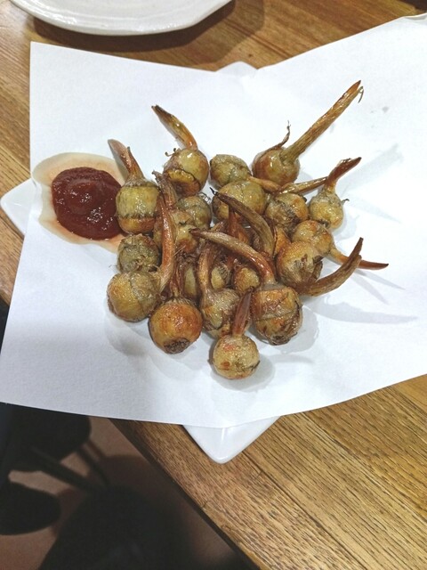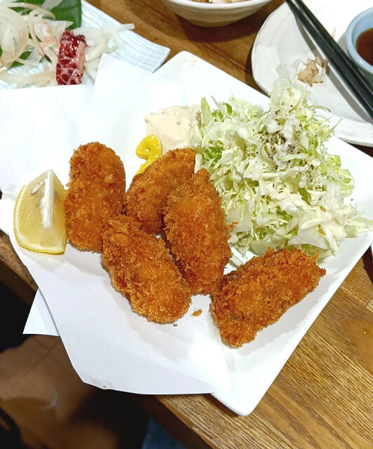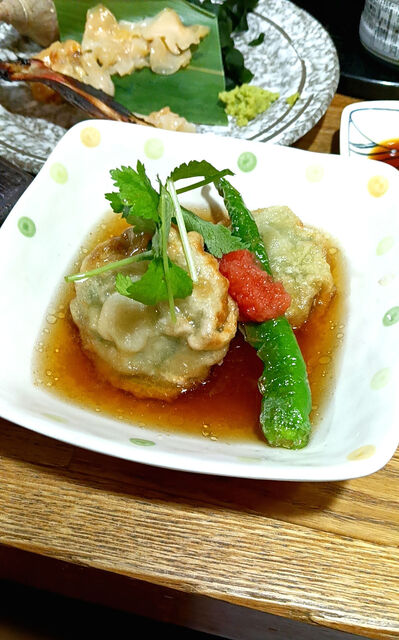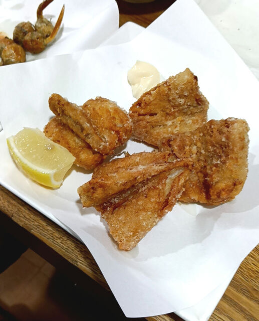鳥の唐揚げやポテサラといったグランドメニューもあるし、魚貝が並ぶお勧めメニューもある。毛蟹甲ら盛りが特価だったので迷わず注文(写真)。ハガツオ、...