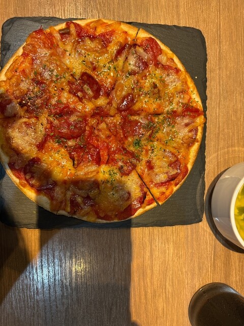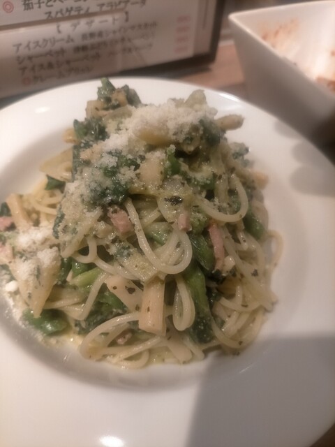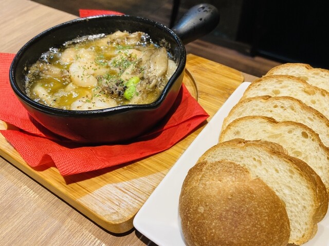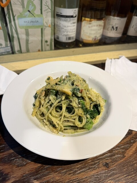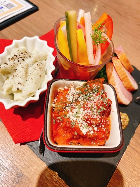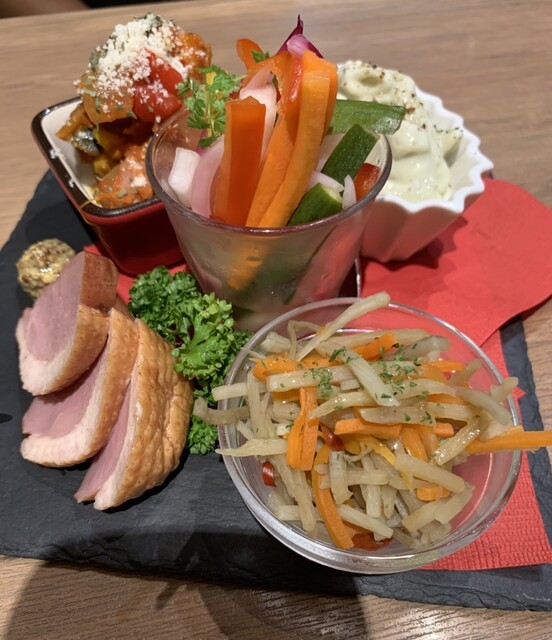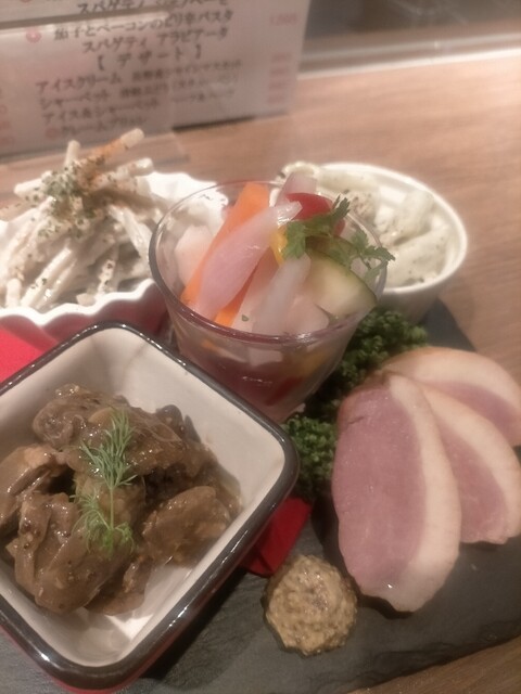 初めて行きました。昼間から結構ガッツリ飲めます!料理はボリュームあり、かなりお得感あり!前菜盛り合わせ、ラタトゥイユ、レバーの煮込み、ガーリックシュリンプ、パスタはジノベーゼ。盛り合わせはその他の前菜...