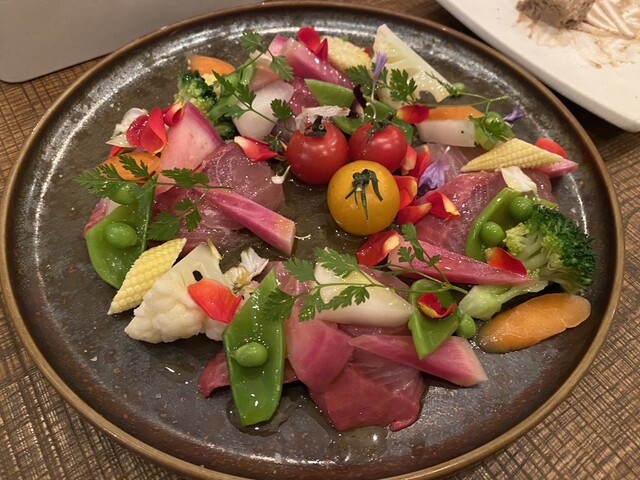 その後に来たカルパッチョも、何と艶やかなビジュアル。目だけで楽しめる。