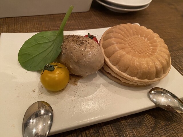なので、イタリアンなんだけど最初はビールを注文…ダメならすぐに出られるようにね…、そして検索時に評判が良さそうなレバーとフォアグラのペーストとモナカの組み合わせの前菜をオーダー。