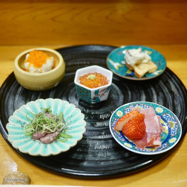 今回は10,000円税込のコースを予約して知人と伺いました。 スタートの前菜から、もうヤラレてしまいます。 生ハムと苺、チーズ。チーズが絶妙です♪スパークリングワインが進んでしまいます。 オマール海老の茶碗蒸し?は着卓した時点で香りがヤバい!香りでご飯食べれそうです。勿論上に乗った海老... 詳細を見る