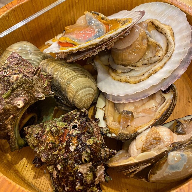 海の家のような開放的な空間で楽しむ、臨場感抜群の浜焼き体験◎水槽から引き上げた活貝を自分で焼き、音や香りと共にお楽しみいただけます。名物の蟹味噌甲羅焼や海鮮が盛られた浜焼きセットの他、刺身や焼き魚、揚げ物、寿司など多彩な一品料理もご用意♪