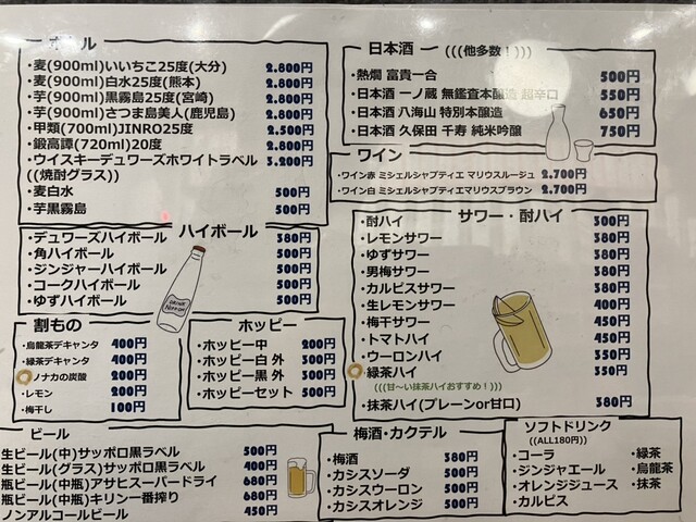 | ドリンク | 日本酒あり、焼酎あり、カクテルあり、日本酒にこだわる、焼酎にこだわる |