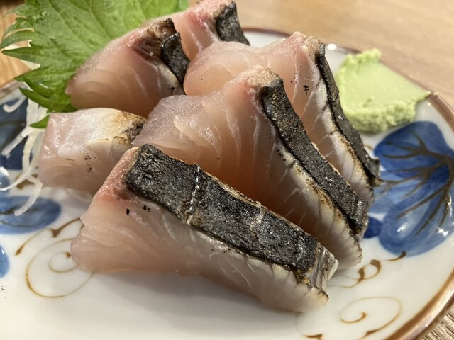 サワラ炙り刺身。臭みもなく、優しい魚の甘味と炙りの芳ばしさが美味。