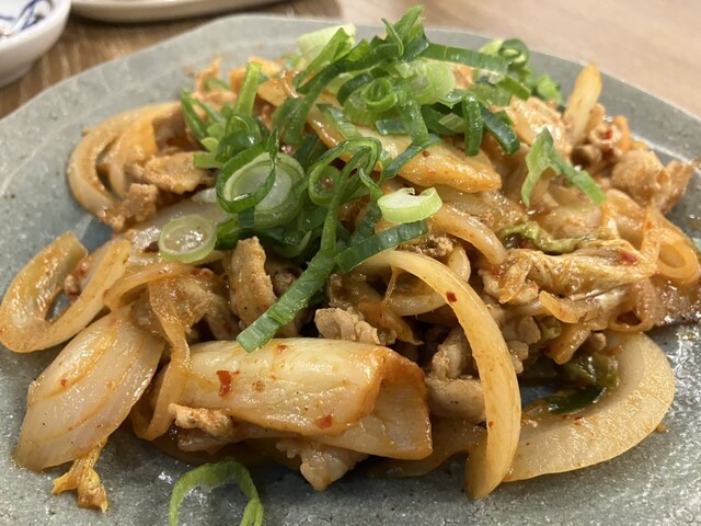 豚キムチ。キムチのコク旨な味わい、キムチと豚肉とタマネギのバランス、いずれも良き。辛過ぎず甘過ぎず塩っぱ過ぎず、絶妙な塩梅の味付けで旨し。