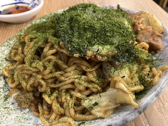 青のりかけすぎちゃいました焼きそば。メニュー名のとおり青のりがすごいので、食べる時に舞い上げたりむせないように注意が必要。ソースの味付けも良く、青のりの磯の風味がしっかりと鼻に抜けてきて旨し。