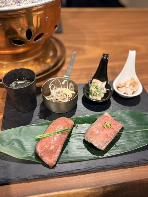 • 黄金色に輝く銅製の七輪が鎮座し、立ち上る炭火の香りが食欲を優雅に刺激する。