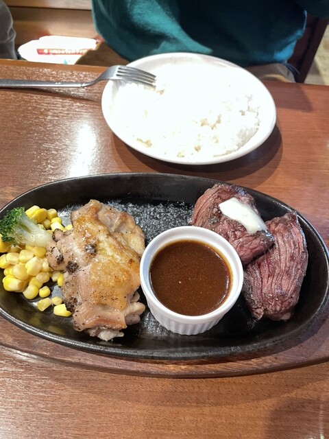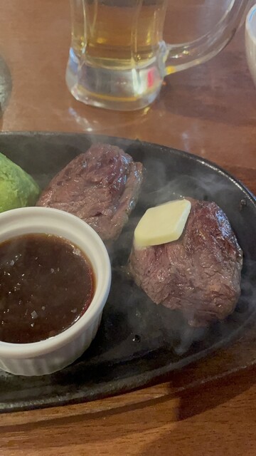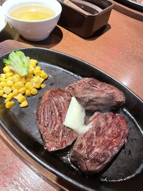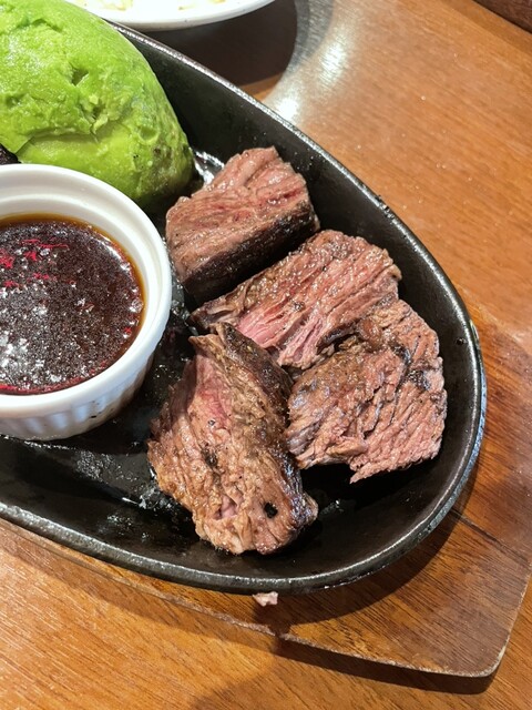 お肉は鉄板でジュー!ジュー!と音を立てながら登場!美味しそ〜‼︎(*゚∀゚*)オーダー時は焼き加減等聞かれませんが、ナイフで切ってみると真っ赤なかなりレアな状態で来ますので鉄板に押し付けて不安のない焼き加減にしてから口に運びました。ものすごく柔らかいです‼︎肉肉しさも感じられるのですが赤身肉とは思えない程の脂ののりと柔らか‼︎卓上にステーキソースとおろしニンニク、岩塩、マスタード、ケチャップ等セットされており、ステーキソースとおろしニンニクを混ぜて食べるのが美味しかったです!