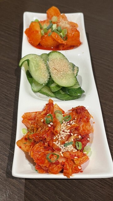 内容は、サラダ、キムチ、ナムルと定番が最初にず...
