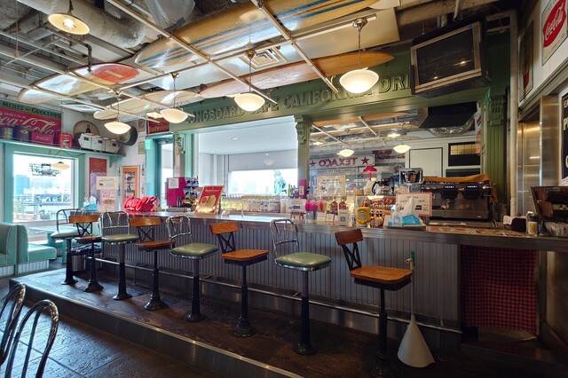 懐かしのキャプテンサンタのグループが運営するお店で、カリフォルニアのドライブインがコンセプト。店内にはヴィンテージのコカ・コーラグッズや、ロングボードなどのオーナーのコレクションがディスプレイされています。