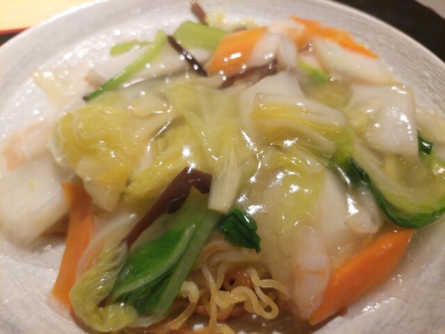 干し豆腐の細麺で海老やイカ、白菜などの具でそれほど辛くない...