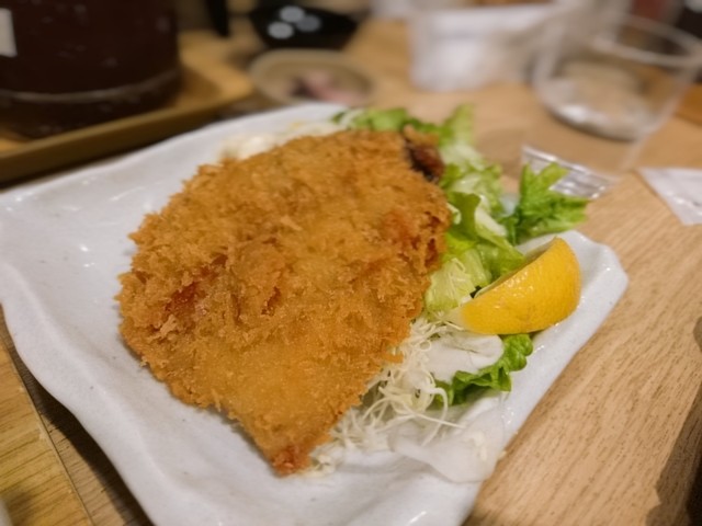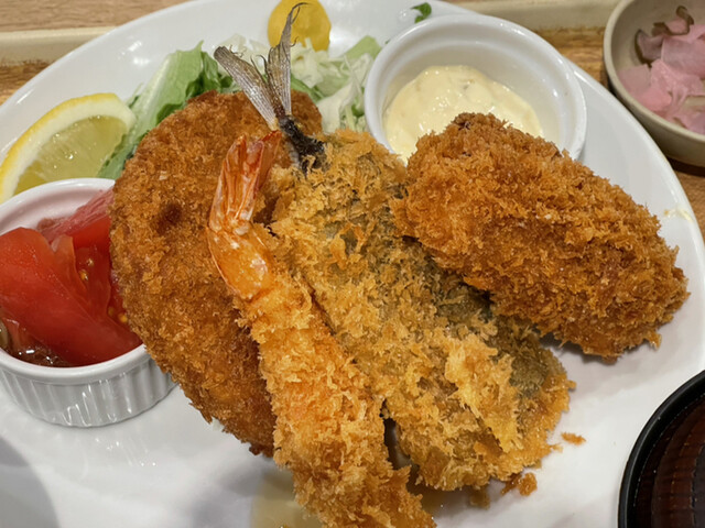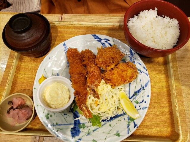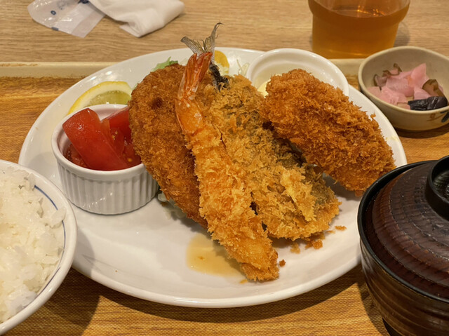 店員さんへか「フライ定食はナニですか?」と問うと「エビフライとアジフライ、それと牡蠣クリームコロッケです!」というので、「それ下さい❗️」とした(...