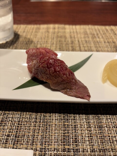 最初は肉寿司、軽く火を通しただけなので蕩ける