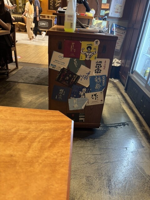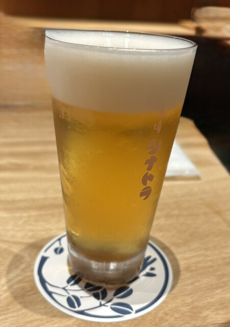 オープンな入り口。普通の居酒屋さんかなと思って、通していただいて店員さんから、雨で濡れたことへの気遣い、そして、上着をかけてくれようとする。びしょ濡れで申し訳なくてこちらでかけたあと、ビールをオーダー。